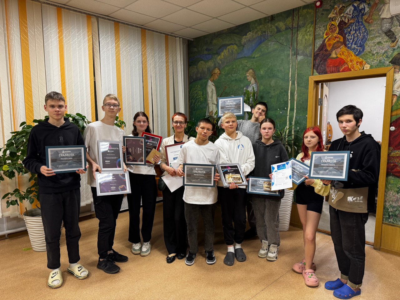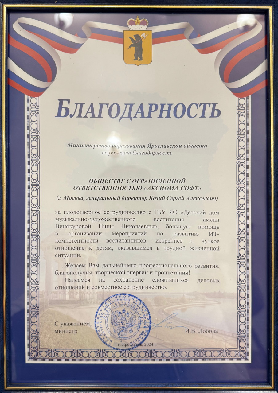 В декабре 2024 года в Детском доме состоялся «Официальный Юбилей», 75 лет его работы. В ходе торжественных выступлений было произнесено много трогательных слов благодарности и поздравления с юбилеем, в том числе и от руководителя нашего проекта «Дорога в IT» Яны Раборовской. В числе многих наград, врученных Детскому дому за многолетний труд, Министерство образования Ярославской области вручила компании «Аксиома-Софт» Благодарность за плодотворное сотрудничество с ГБУ ЯО «Детский дом МХВ им.Винокуровой Н.Н.», большую помощь в организации мероприятий по развитию ИТ-компетентности воспитанников, искреннее и чуткое отношение к детям, оказавшимся в трудной жизненной ситуации.