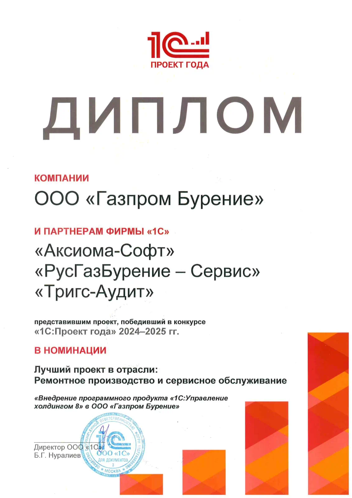 Проект «Внедрение системы контроля финансовой деятельности на базе «1С:Управление холдингом 8» в ООО «ГПМ МАТЧ» победил в номинации «Лучший проект в предметной области (ИТ-услуги, телекоммуникации, интернет, связь)».